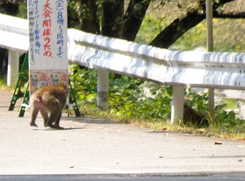 先日、「砂金掘り大会ミニ2021」開催日の前日のことでした。大会当日に車の来場制限があることを告知する立て看板の手前に、サルたちが見られました。看板の手前の他、ガードレールの向こう側にも、計2匹の野生のニホンザルでありました。 実は、ここのガードレールの向こうに、下部川の河川敷に降りることができる道がついていたのです。 先ほどのサルの先頭(ガードレールの向こう側にいた)に何か異変があったらしく、たいへんな勢いで後ろ側のサルが山の方向に走り去ってしまいました。 先に進んでいたサルもたいへんな勢いで、山にもどりました。 川で何があったのか、近くの温泉橋の上から見て納得です。サルがこわがっていたのは、川遊びしてたニンゲンの家族の存在のよう、と気付いたのでした。