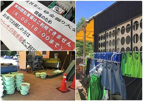 前回の記事でもご案内しましたように、当館の名物イベントである『砂金掘り大会』がミニ形式(1日で例年2日分を圧縮実施)により開催されます。それが、次の土曜日(7月24日)に迫ってきているのですが、これまでも開催企画から事前周知活動(チラシ作成・配布)など、相当なパワーがつぎ込まれてきました。加えて、大会運営のための細かで多彩な準備作業が、いままさに展開されています。 今回の写真は、そのようすの一部で、当日の駐車場規制の案内掲示(左上)や競技用の砂金を仕込むための砂バケツの用意(左下)、またビブス(bibs、競技用ゼッケンの一形態)の風通し(右)などであります。 当館の専任スタッフは、たいへん数少なく、通常の博物館運営にかかる業務の他、下部リバーサイドパーク管理関係の業務など、多岐にわたるものをそつなくこなす上に、こうした大会についても汗を流しております。 大会当日についても、十分お楽しみをいただけるようにがんばっているところですが、その辺りをご理解いただき、熱烈なるご支援を賜りましたらこの上なき幸いでございます。
