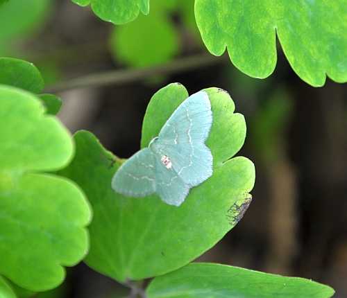 オダマキの葉の陰の部分に、ひっそりととまっていたシャクガ科のガが見られました。アオシャク亜科の1種と思われますが、似たものが多く、おそらくホソバアカハラアオシャクだろうと思われます。子どもの時のシャクトリ虫の面影はまったくない、完全変態の昆虫のあり方が感じられました。