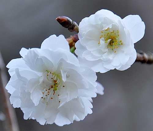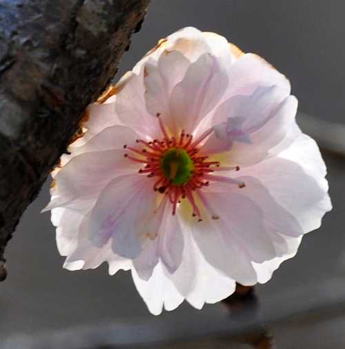 今日も多くの花をつけていたジュウガツザクラですが、その中で、咲き進んで花散る直前近くのものに目をつけました。 最初に取り上げたこの花は、だいぶ咲き進んで、一部に痛みが出てきています。 もうすぐ散りそうな花があって、傍らには小さなつぼみもいくつか。 咲き進んで色濃くなったの、その上にはすでに花びらを散らしたのや大きなつぼみ、下側にはまだ花開いたばかりのが見られます。 このように、次から次へと花のリレーが続いていきます。