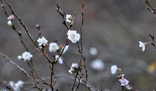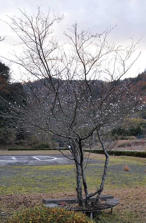 お昼ごろに見たジュウガツザクラの木、たくさんの小さな花をつけています。 今朝は、たいへん冷え込みがきつく、地面は数㎝ほど凍上していますが、思ったよりジュウガツザクラの花は、しっかりしていました。新年までしばらくの間ご無沙汰になりますが、また元気にお会いしましょうね、と語りかけたものです。