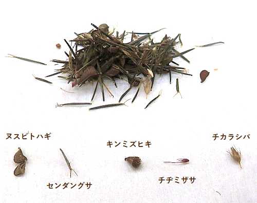 今日は、曇りで時折霧雨が舞うなか、とある目的でフィールドに出て、捜し物をしました。なかなか難航の末、ようやく探し当てることができ、博物館に帰って成果を確認、の前に・・・。 ズボンや靴下、上着の袖や裾についてきた、たくさんの「ひっつきむし」の処分に時間を割かれました。結果、ご覧のような限定版「ひっつきむし図鑑」ができました。