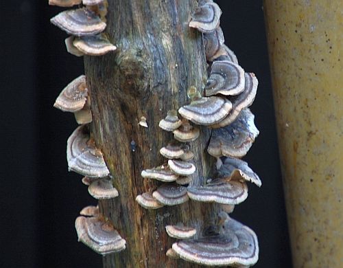 サルノコシカケを小さくしたような・・・。おそらくマンネンタケ科のキノコの1種だと思われます。マンネンタケというのにも、似てなくはないのですが、マンネンタケは、漢方の薬用とされ、またガンを抑制するとかで高値取引もあるようです。でもこちらは、ちょっとばかり違っているようです。木材腐朽菌の一つ、コフキマンネンタケというのがあるようですが、それに似ている別物の木材腐朽菌のようです。 博物館の別棟倉庫の裏手に立てかけてある古い自然木に生えていたもののスケッチでした。