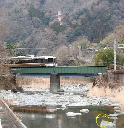 身延線下部川橋りょうの少し上流に、1羽のカワガラスを見ました。黄色の円の中心で、川面に出ている石の上です。 この時の天気は、曇りで、少し暗い感じがする状況でしたが、そんな環境をカワガラスは好みますので、晴れの日は観察できません。曇って少し暗いな、だからいる…と、予想してのぞみましたが、当たりでした。 その望遠スケッチです。カメラを意識してポーズをとっているわけではありませんが、かわいいものですね。 この撮影後に、博物館スタッフに写真を見せたところ、「カラスの仲間には見えない」という率直な感想がありました。でも、その時まだ、カラスの仲間だと信じていました。 いま、改めて確認すると、カワガラスはスズメ目カワガラス科カワガラス属の鳥だということでした。(博物館の皆さま、訂正させていただきます) しつこくレンズを向けていたせいか、上流に向かって飛び立ってしまいました。 で、行き着いた先で、流れに潜ったりしながら、えさを探していました。 最後ですが、この時のベストショットをご覧ください。 蛇足ですが、この撮影の直前に、カワガラスがうんちするのを目撃しました。白い水っぽいもので、石の上を流れるように・・・。このカットの白い線は、その時のものではないのですが、いずれカワガラスのうんちです。前の写真で見たようにカワガラスは、流れに潜って、「カゲロウ、カワゲラなどの幼虫などの水生昆虫やカニなどの甲殻類、小魚を捕食する」(出典:ウィキペディア)ということで、どうしても水っぽくなるんでしょうね。