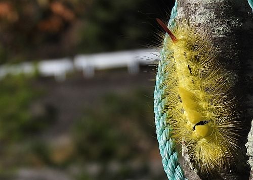 下部リバーサイドパークの木で、かわった毛虫を見ました。リンゴドクガの幼虫です。黄色の毛虫ですが、陽の当たり方で、金色に見えました。