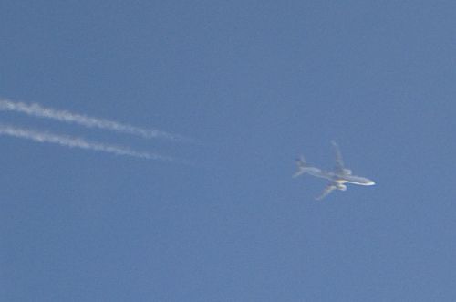飛行機って、これです。過ぎゆくその後ろには、いわゆる飛行機雲が・・・。