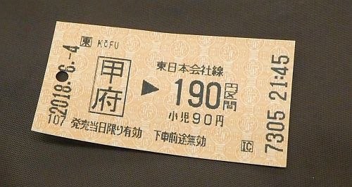 発車時刻の3分前に発券された乗車券です。190円区間で、甲斐住吉駅まで・・・。