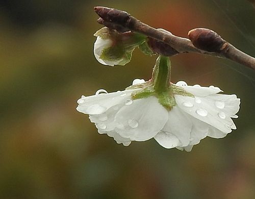 ややうつむいて咲いたサクラに、昨夜からの雨があたり、雨粒がいくつも残って