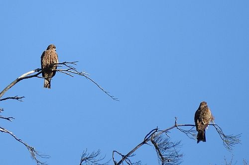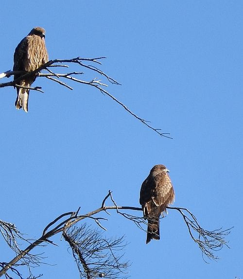 トビでした。しかも2羽。そこも陽が当たっていて、羽を休めているトビたちは、何