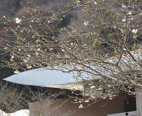 湯之奥金山博物館の正面玄関をバックに、ジュウガツザクラのいまを見ました。