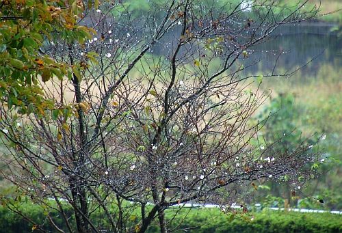 面玄関前の軒下からのジュウガツザクラの鑑賞です(18mm広角撮影、桜色の円の中)。