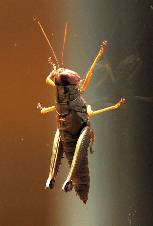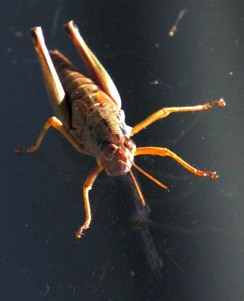 ラス壁の外側に、フキバッタの仲間がとまっていました。ガラスにも滑り落ち
