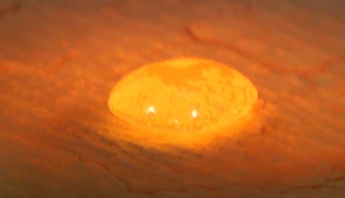 融けた金の粒が、だんだんと塊になってきています。金は表面張力により、