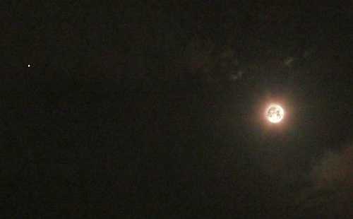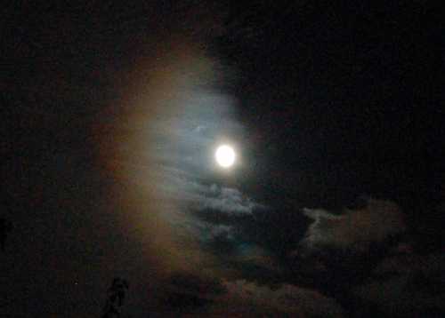 その場面、少し広く見ました。薄く広がる雲に月の光が作用して、暈ができて