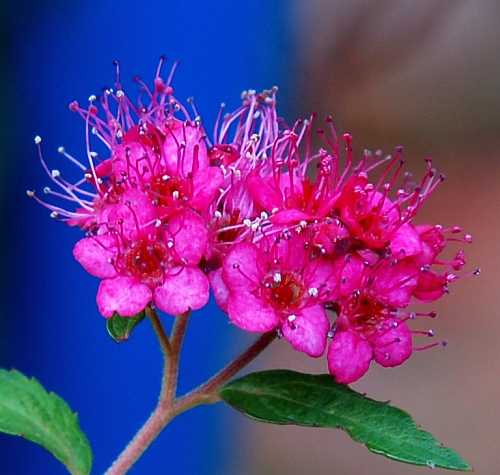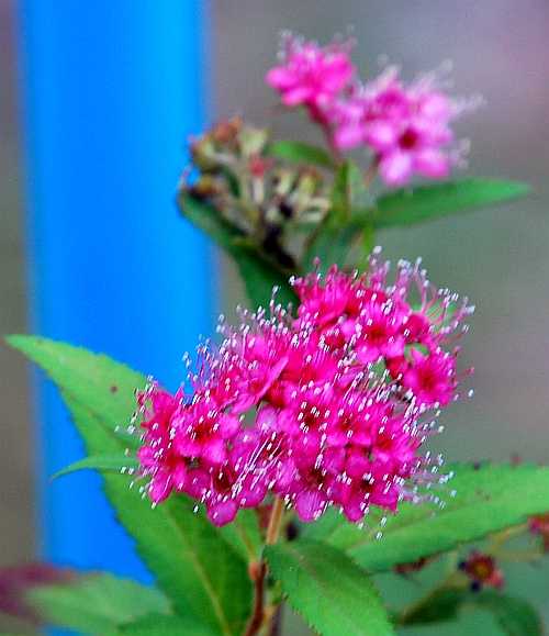 ちなみに背後の青いのは、このシモツケの苗木を植えたときの支柱の色でした。