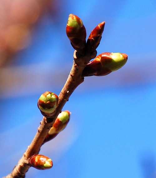 ザクラの枝先には、こんなふうに茶色の上着を脱ぎ、先が割れるほどにまでなっ