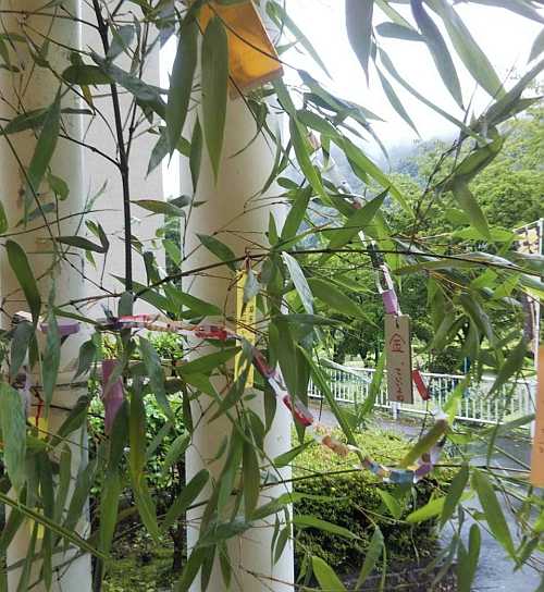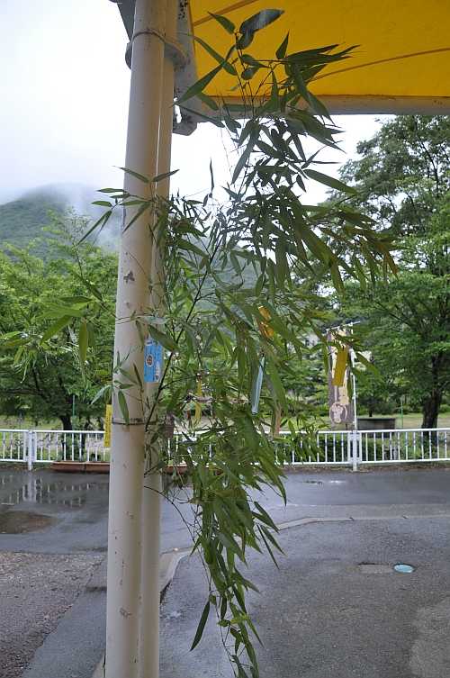 笹飾りは、強く弱く降り続く雨を避けて、テントの内側に向け立てられています。