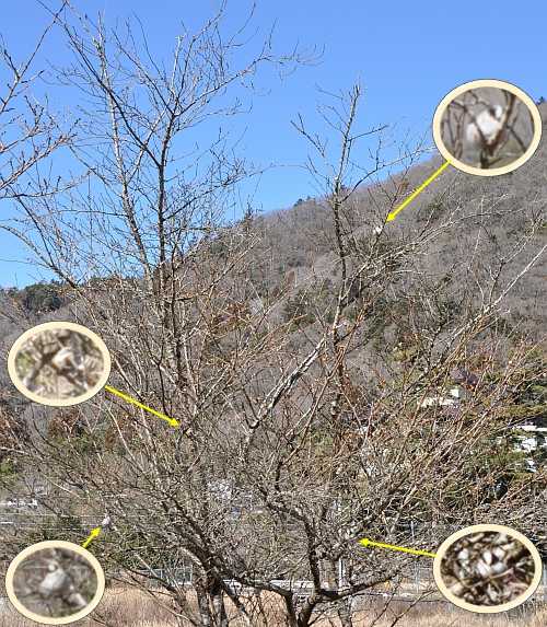 こちらは、今日最初にエナガの集団を見かけたジュウガツザクラの木です。