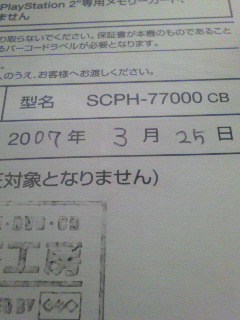 PS2買っちゃいました(^^ゞ今日も今日とて倉敷に出張ですが、お昼休みにお店に行ってきました。”9800円の中古あるん?”と聞いたら、まだ在庫がありました。で、この間の日曜日の日付が入っただけの、もしかして新品??が9800円でした(^^)お店の保証は1週間だそうですが、メーカーの保証が丸1年付いてきました。こりゃラッキーだねヽ(゚∀゚)メ(゚∀゚)メ(゚∀゚)ノただ、メモリーカードが要るんですねぇ。こりゃ知りませんでしたよ。えらく高いしさ…ゲゲ(゜_゜;)フラッシュメモリが1GB2千円のこの時代に、たった8MBで2千円だぁ??ぼろもうけだね、これ…