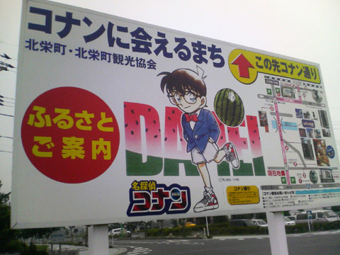 さてさて、昨日から山陰に出張に行っていたわけですが、今日は朝から米子市内での仕事を終え、鳥取県の東伯郡まで移動しました。その道中(と言うより目的地のすぐ近く)の北栄町は、名探偵コナンの作者さんの故郷なんですね。と言うことで、記念館やらコナン通りやらがあって、コナンで町おこしをやっております。連載終わったらどうなるんだろうなどという、要らぬ心配はさておいて、夏休み中だけあってかなりの人が来てました(^^)道の駅にも看板が。銅像もあります。この銅像は由良駅近くの図書館の入り口にあります。コナン通りにある外灯もこの通り。記念館前に置いてある車です。北栄町のHPはここ。こなん探偵社のHPはここ。子供を連れてきたいと思いつつ、高速使っても4時間はかかります。風力発電の風車もすぐ近くですから、一緒に見せれば良いとは思うんですけれども、もう一つ何か目玉があったらなぁ~って思っちゃいます。鳥取花回廊がここから1時間ちょっとの所ではありますが…日帰りはきついよなぁ…(^^ゞ