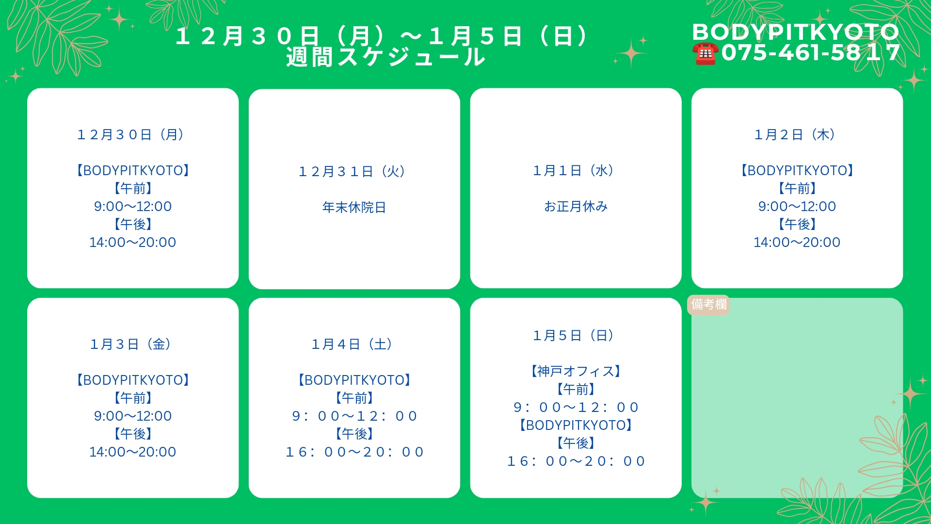 BODYPITKYOTO院長藤崎進一です!皇紀2685年令和7年乙巳1月2日(木)9:00〜20:00予定では3日まで正月休みの予定でしたが、明日から営業致します!令和7年もBODYPITKYOTOをどうぞ宜しくお願い致します(^^)正月疲れ、行くところない、金閣寺、北野天満宮、平野神社、大将軍八神社、妙心寺、仁和寺近くのBODYPITKYOTOでお待ちしておりますm(_ _)mBODYPITKYOTO京都市北区大将軍一条町134☎075-461-5817ご予約は⇛http://bodypit-kyoto.jp/yoyaku/
