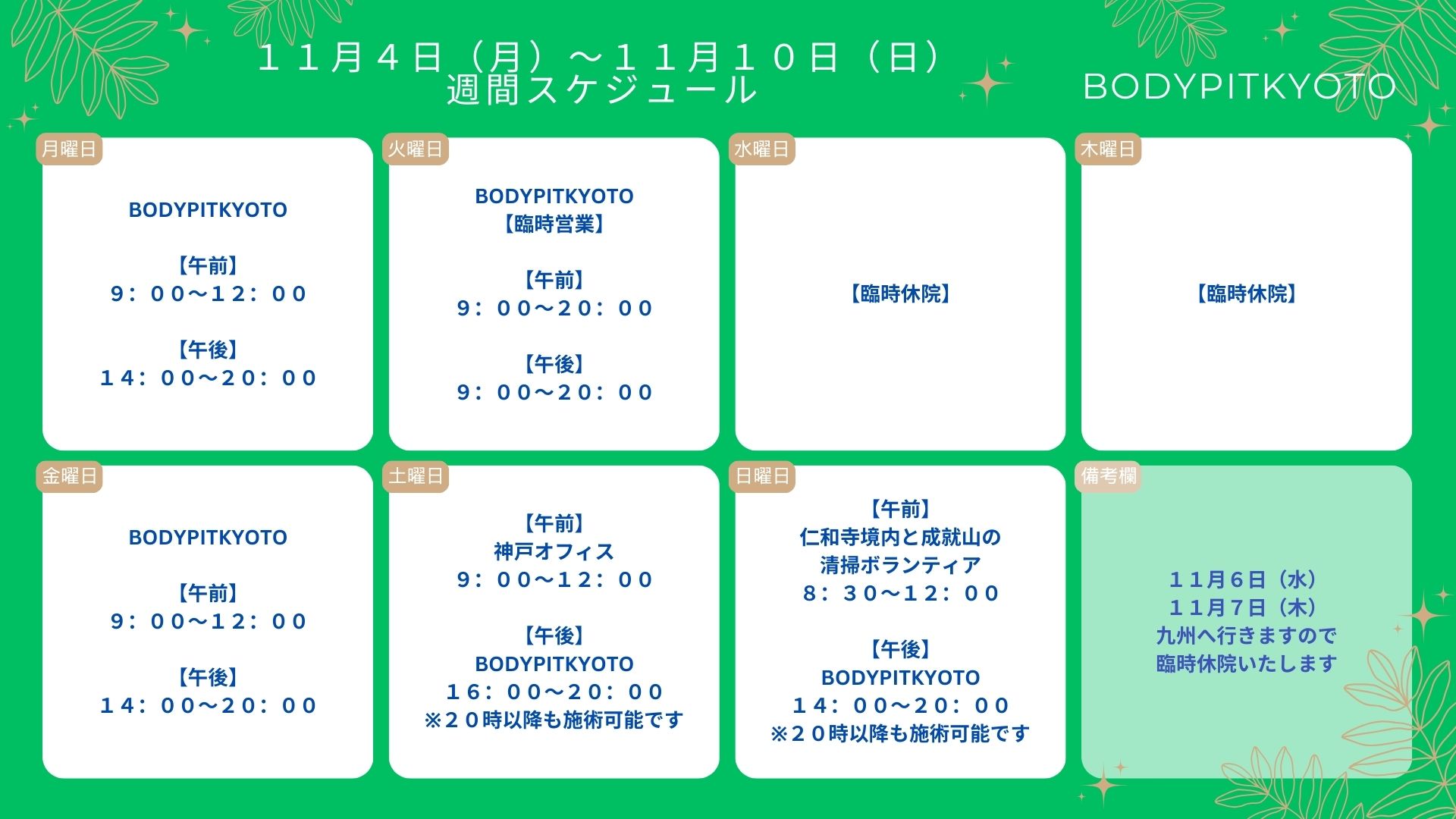 BODYPITKYOTO院長藤崎進一です。皇紀2684年令和6年甲辰11月4日(月)9:00~20:00通常通り営業いたします。いつもご来院洵にありがとうございます。3連休最終日。京都観光でお疲れの方はBODYPITKYOTOでスッキリされませんか?BODYPITKYOTO京都市北区大将軍一条町134☎️075-461-5817ご予約は⇨http://bodypit-kyoto.jp/yoyaku/