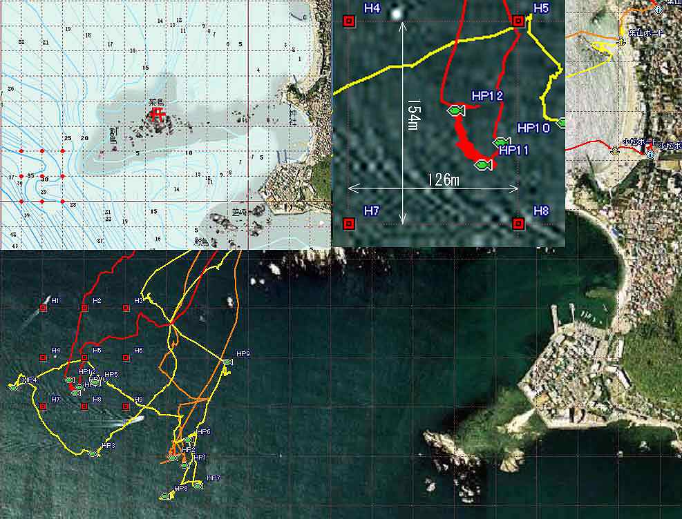 5月3日葉山の小松ボートよりてご島沖で竿マキコボシ釣りをしてきました。下の写真はボート軌跡とポイントマーク(魚印)と位置目印(赤四角)です。黄色線は1/9 茶線は1/29 赤線が5/3 となってます。この海域の海図を用意して位置目印を書き込み、同様にハンディGPSにもポイントを入れておきました。今回は赤線ログで表示してありますが、拡大画像でも紹介してます。HP10に6時40分から始め30分程でHP11に走錨、HP12まで走錨しながら13時30分までの釣りでした。アンカーはボートに積まれたフック式の物でロープの長さがあった(葉山釣具センター足さないと深場では短かったです)ので継ぎ足しはしなかったのですが、短めかウエート不足だったかも知れません。ハンディGPSの走錨アラームは40mに設定してありますが、1回鳴っただけでした。沖釣りではこのアラームは力強い味方となります。葉山の沖釣りは3回目で目的のポイントが分からないので多少の走錨はOKなのですが、海図で判断できる範囲にアンカーを入れてました。とりあえず試したポイントは今回で12ポイント(HP※※)となりますが満足な釣果も無いので早々容易く開拓できることでも無いので気長に通い続けようと思っています。私の魚探はホンッデックスの初期の電池タイプで当然底質や微妙な変化を捉えることができません。早く新しい魚探が欲しいのですが今一気に入った物が無いので・・そうそう、釣の話ですが6時~13時で11時過ぎからは魚っけも無くの早上がりでした。昼に風が治まる予報でしたがそれなりに吹き続けていました。今回はアジが3匹、真サバが2匹お持ち帰りの寂しい内容でしたが、丁度晩御飯のおかず量でしたので私的には満足です(笑ただアジ34cmと真サバは太った36cm、特に真サバはSMでのノーシンカーで初めての手応え。ビシが無いとなかなか面白かったです。