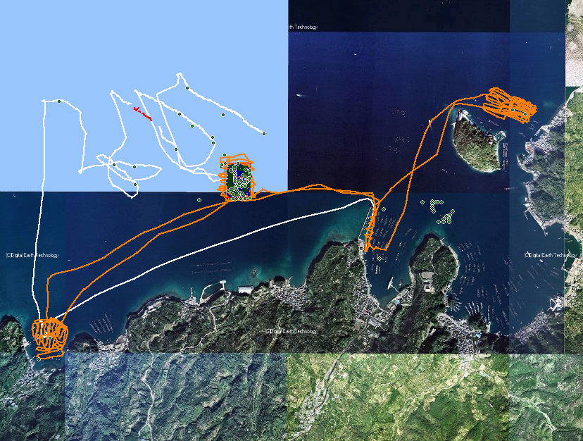 19日のボートログ(オレンジ線)です。これはハンディGPSデータをカシミール3Dの写真地図に表示したものです。ログの密集した場所左から古宇、ワラサ根、淡島北東です。このログはロランスGPS魚探にもありますが、当面こちらが使い慣れていますので併用しながらまとめていこうと思います。データ取りですがワラサ根ではソナーデータは記録出来ませんでした。これはトランスデューサーの取り付けが浅めだったことと速度が速く途中エァーの影響で時々深度計測値が点滅表示しモニターも記録が出来なくなることがありました。SDへのカードの記録中を示す赤LEDランプは正常に記録中を示していましたが、途切れると全てのデーターがエラーとなるようです(使い始めのことで確かではありませんが)データを失わないようまめにファイル分けをした方がいいようです。と言うことで今日はハンディGPSのデータをダウンロードしました。 明日はソナーデータをロランスソナービューア魚探の画像をパソコンで同様に見られるソフトでモニターする予定です。