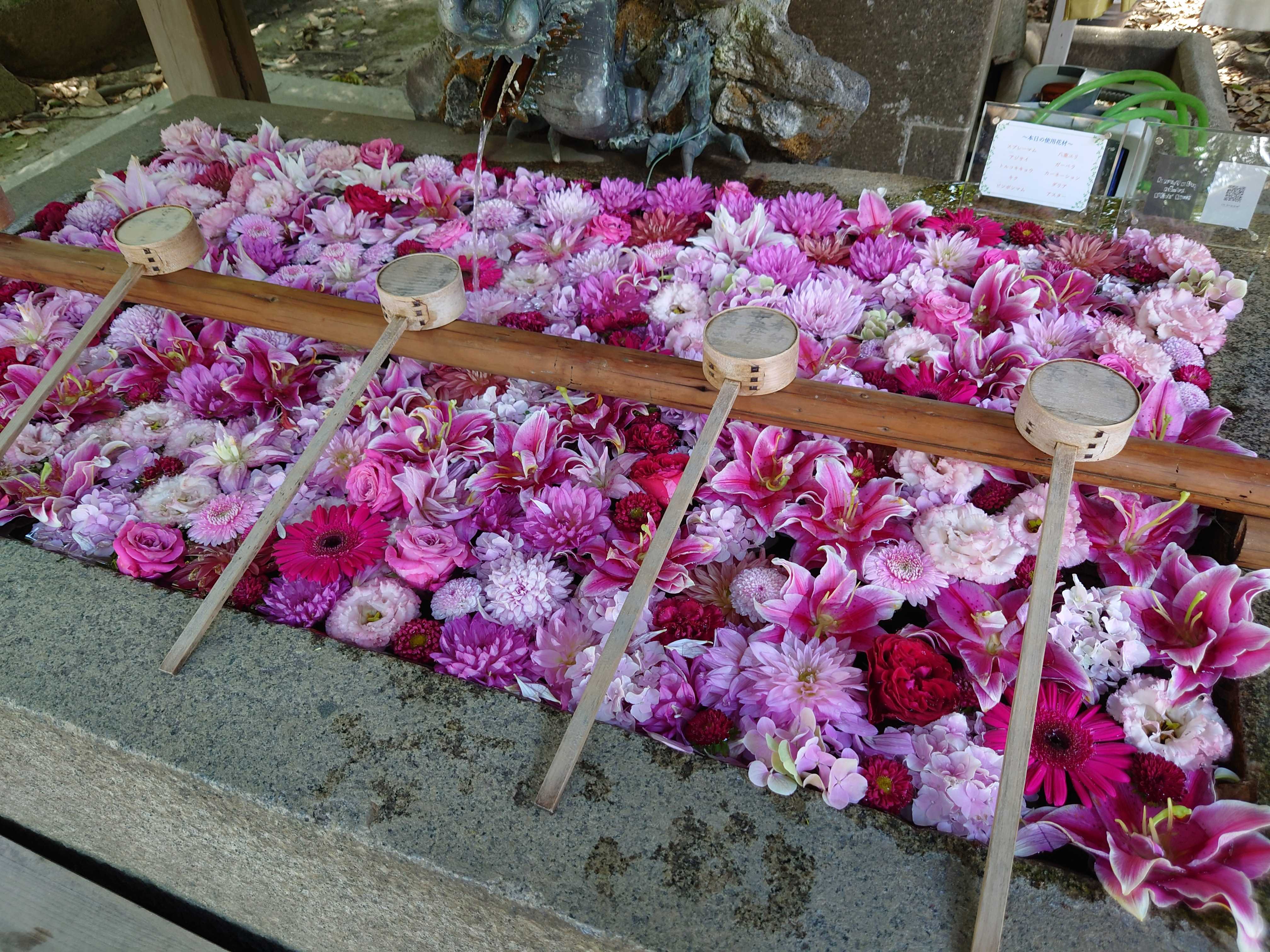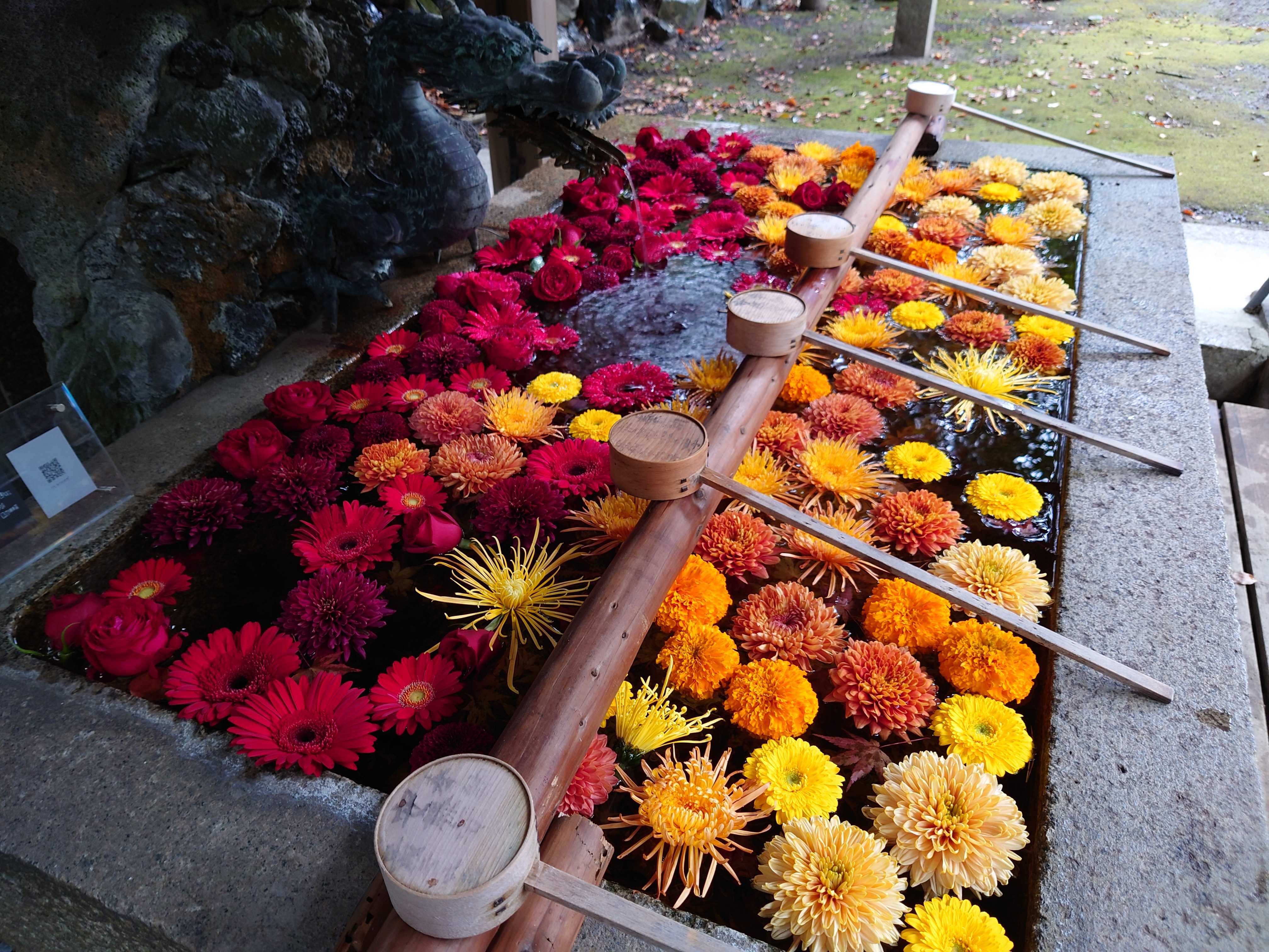 手水舎の花が入れ替わったよ、と聞いてスタコラ見に行く(徒歩一分)これまた素敵☆☆☆ゴージャス贅沢盛り✿✿✿私は何かにつけ黄緑色と他の色の組み合わせが好き