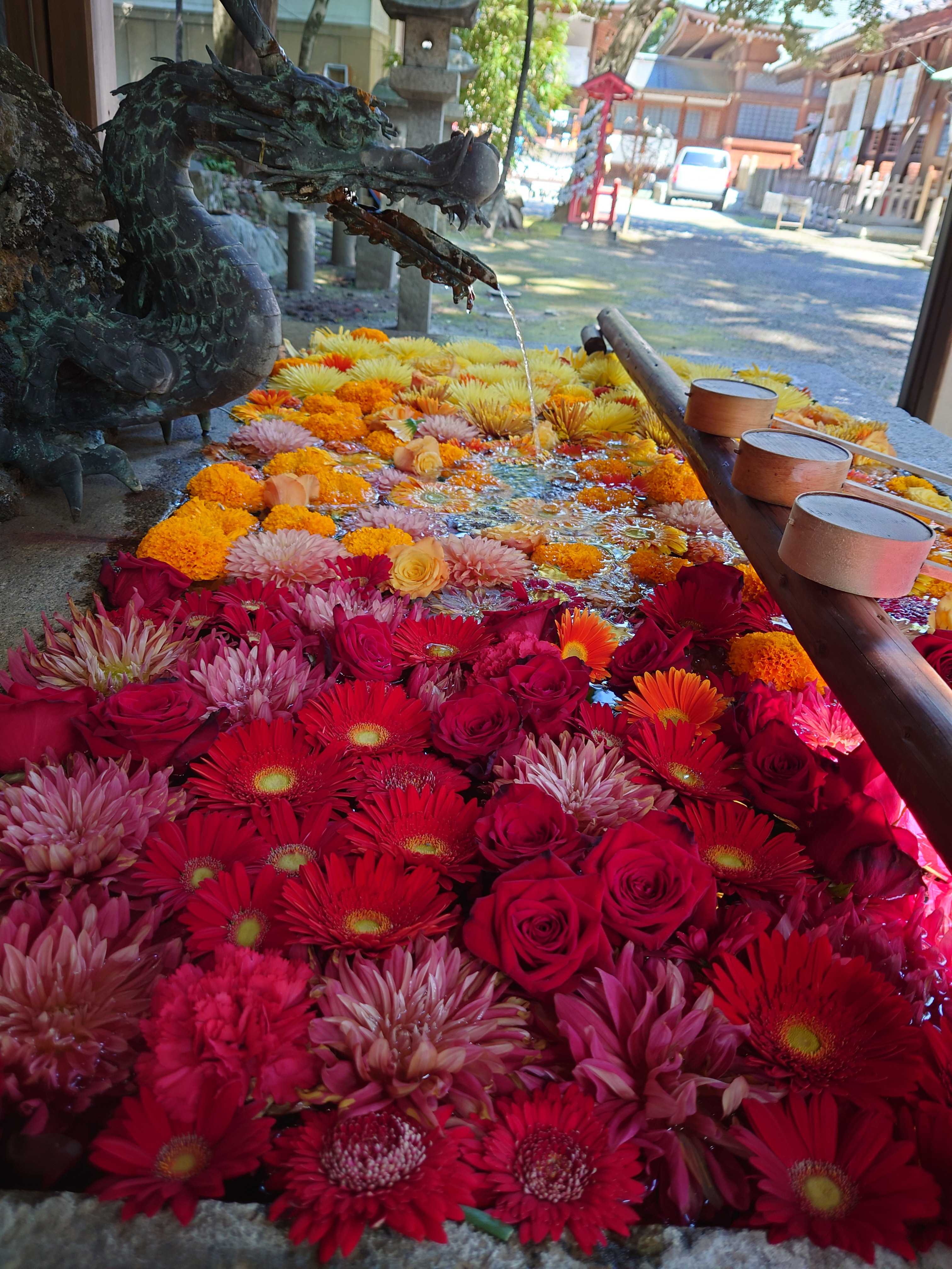 不定期で活けられる手水舎のお花✿今月二度目グランパスカラーだそう(✿^‿^)(サッカーチームの名古屋グランパスね)活けられた日に直ぐ見に行けなくて、活けて三日目に行きました。三日目だと少し沈んでるたり変色してたりあるけれど綺麗、キレイ、きれい✿