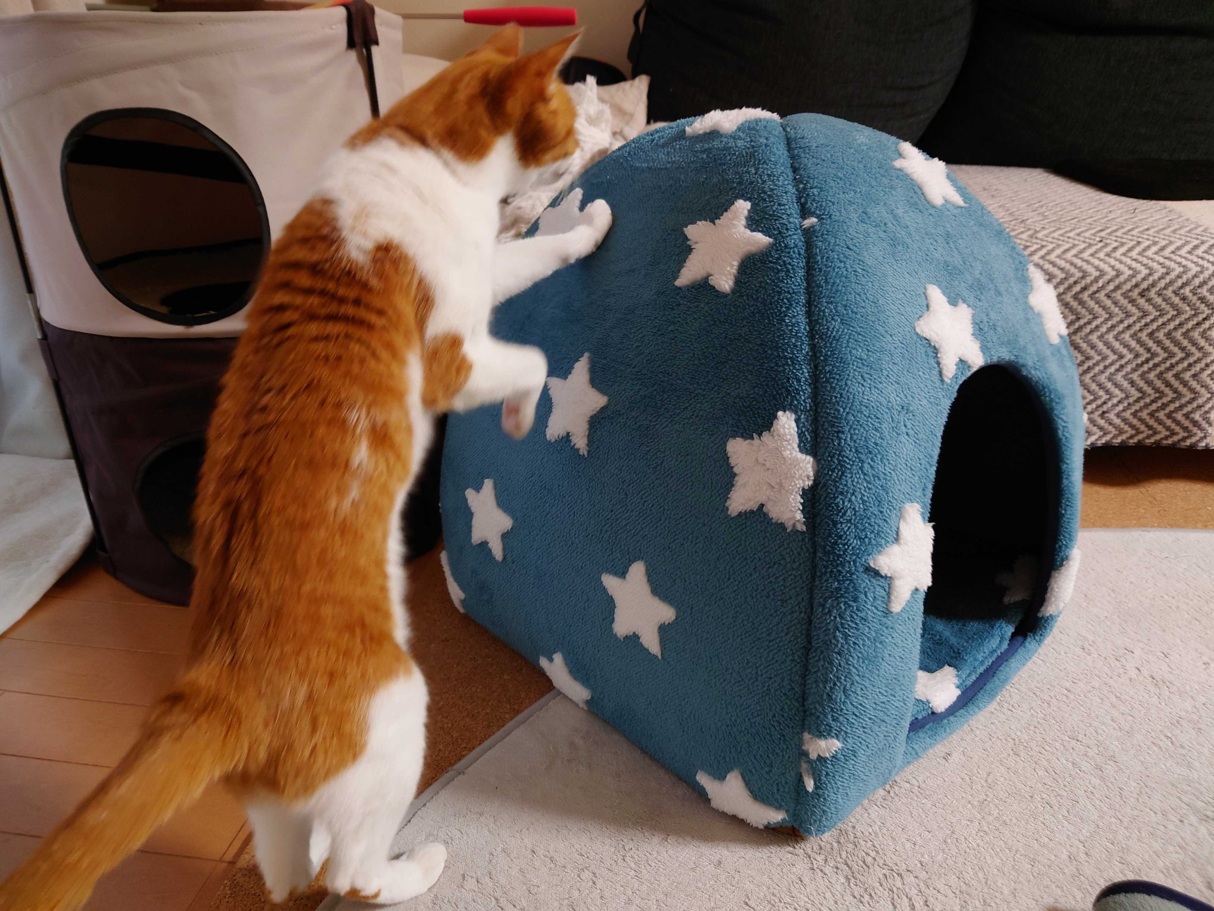 元気です☆味覚臭覚ももとに戻りました☆食欲も止まりません☆ブログネタが無いだけ〜♪セールになるの待っていた猫ベッド セールになってた♪えなさんの好みにピッタリ☆間口が広い、入口足元がフラット、中敷きがフラット(モコモコは好まない)、空間が上にも広い、のびのび寝れるコレなら中に枕入れてもボトル型湯たんぽ入れてものびのび寝れるねー。下に吹いてくるエアコンの冷たい風を遮るのにドーム型が必要。寒がりえなさんは夏も使うので年中必要。前はドーム型もなかなか使ってくれなかったけれど、ここのところ使うようになってくれてウレシイ☆☆☆