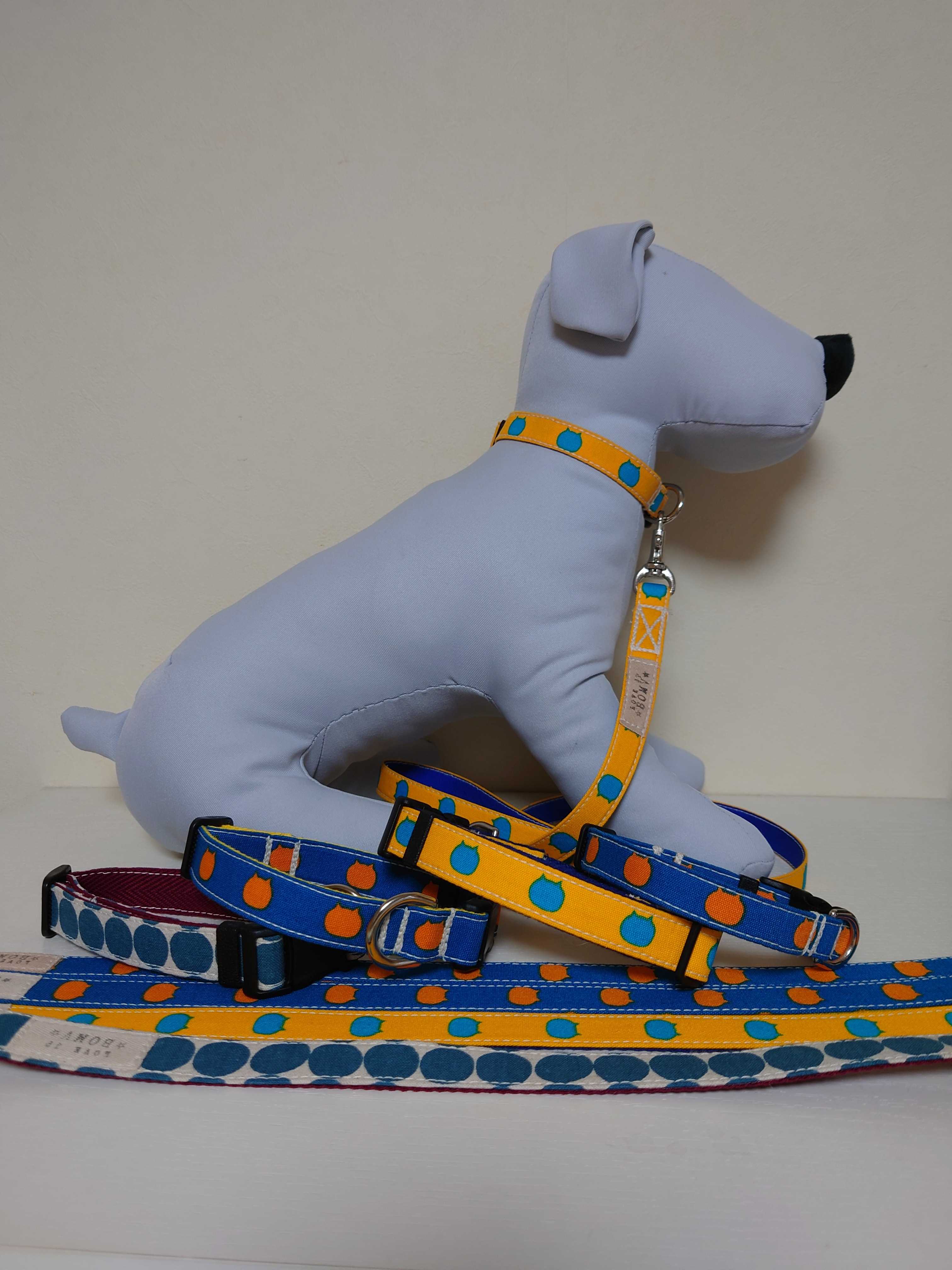 futurocafeにBOMV納品してきました☆BOMV新作入荷です・猫柄カラー&リードセット オレンジ/青 2cm幅 80cmデイリーショートリード・青ドットカラー&リードセット 2cm幅 80cmデイリーショートリード(ループ付き) ・猫柄カラー&リードセット オレンジ/青 1.5cm幅 80cmデイリーショートリード