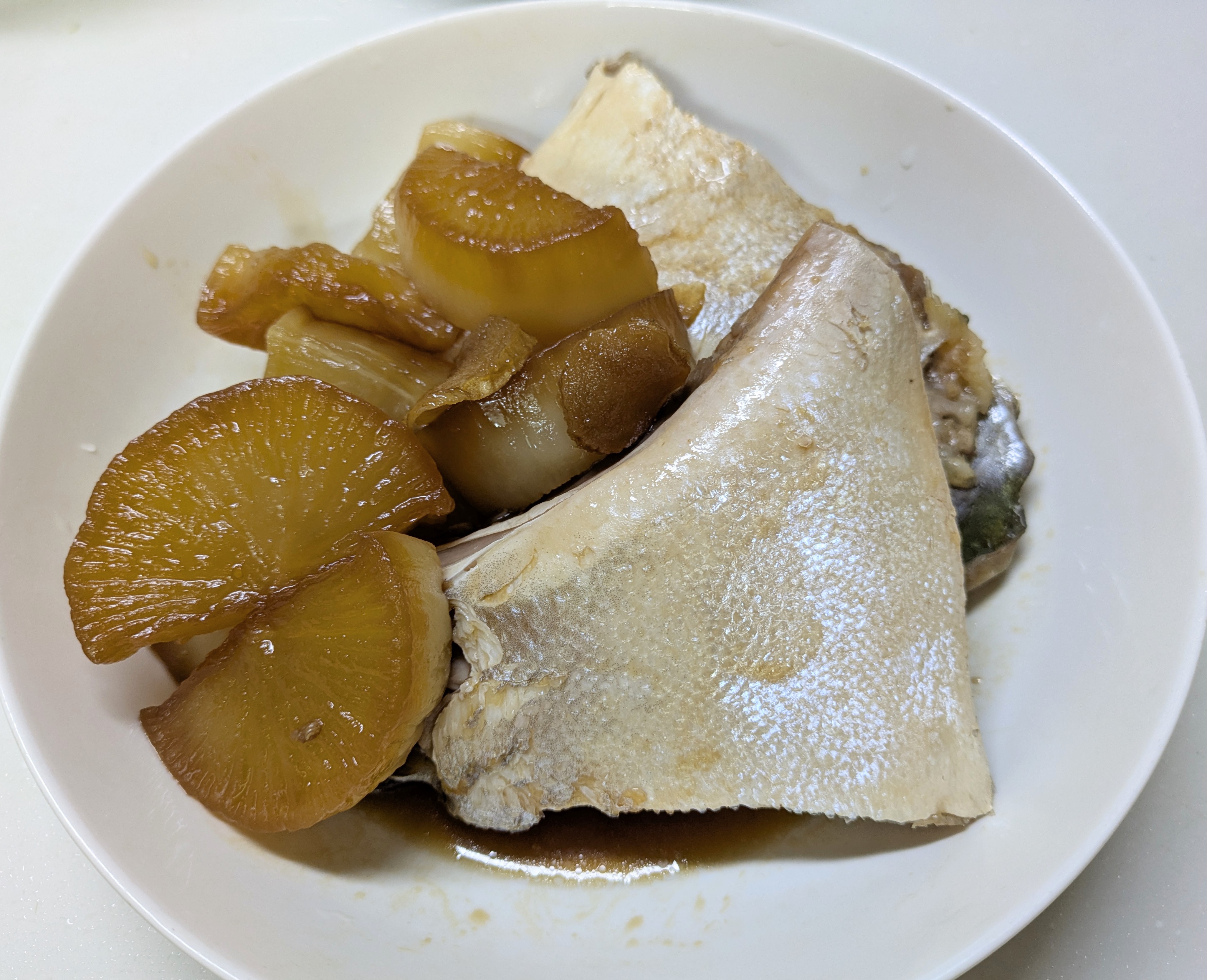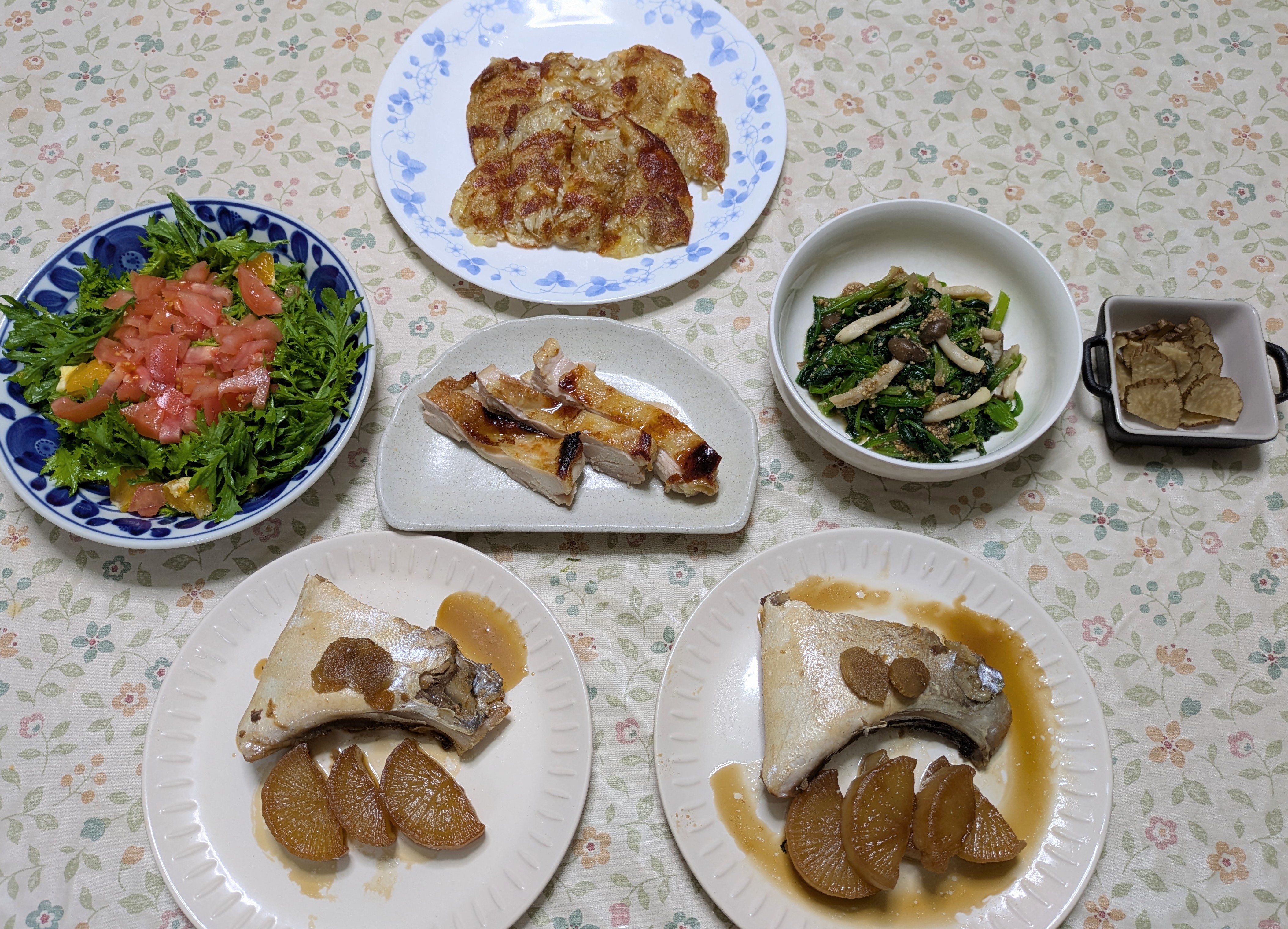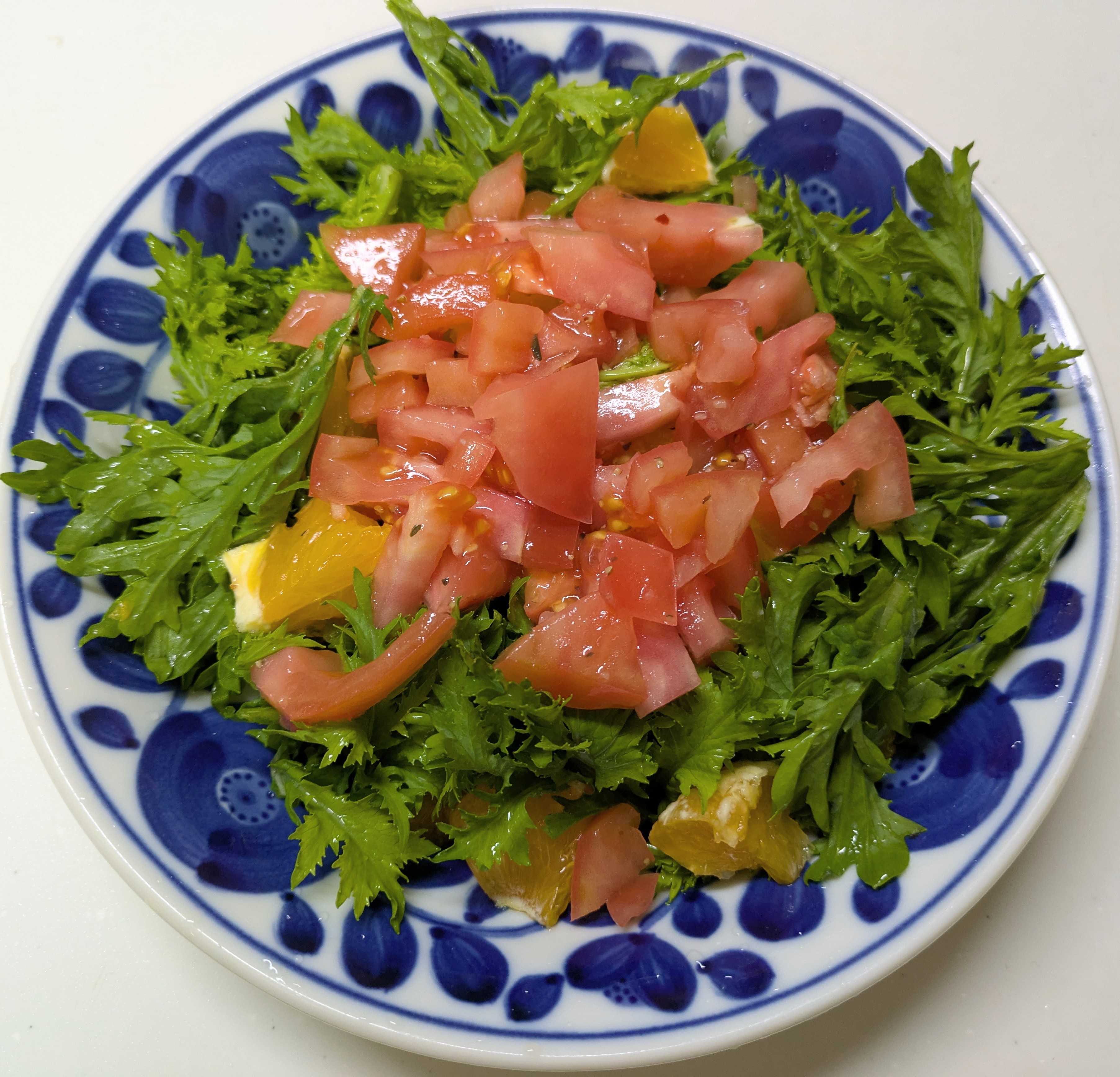 ぶりカマの煮つけ わさび菜とおれんじとトマトのイタリアンサラダ