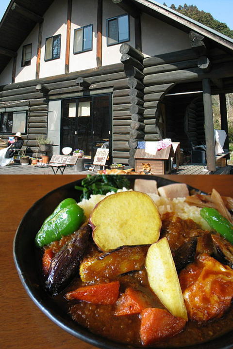 お店の中は写真のようなログハウスです。今日も薪ストーブが活躍していました。山間にあるので、こんな暖かい日であっても、さすがに涼しいです。