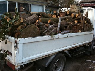 乾いた薪は使い切ってしまったので、まだ湿り気のある薪を燃やしている。来年からは薪を心配しないよう用意しておかなくいと・・・さて北浦三育中学でご奉仕しているI先生から「薪がありますよ!」との情報をいただき早速いただきに行って来ました。杉や桜や樫が混ざっているけどトラック一杯あって有り難かったです。 チェーンソーと斧で割り始めたけど、木の種類によって割れ方が全然違う。杉は非常に簡単に割れる。桜も割りやすい。樫?は手こずる。長めに玉切りされているからだと思うが、斧で割るなら木によって長さを変えるのも方法かもしれない。割りにくい木は短めにカットしておけばいいと思う。杉なら長くて太めに割った方が火持ちもいいしね。我が家のケヤキも相当割りにくい部類なので、35cmくらいにしてみようかな。 クヌギやナラなら割りやすく熱量も高いので良いのだけれど、手に入るものが最高だというのが私のポリシー。