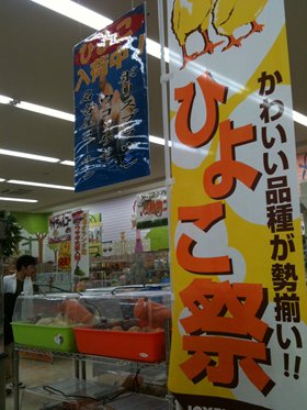 「わーい!祭りだ、祭りだ!」って何の祭り?ホームセンター隣のペットショップに「ひよこ祭り」ののぼりがたってました。 本当にかわいい!鳥好きにはたまりませんなぁ!なんでも小さいうちは文句なしにかわいいもんですね。でも見ていて本当に飼いたくなってしまったのは・・・・ハリネズミ。 ネズミと言ってもモグラの仲間で、えさはフェレット・フードで代用できるらしいけど、コオロギとかなんとかワームとかを与えると喜ぶらしい。夜行性らしく寝ていたが見ていると寝ぼけて起きた子供のようによたよたしながら仲間にくっついてまた眠り始めた。それと、やっぱりモモンガ は飼ってみたいんだよなぁ。まぁ、ペットコーナーに行くといっぱい誘惑があるってことで今日はおしまい!