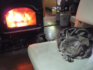薪ストーブの前に寝ることを覚えたチャチャ。すっかり慣れて、仰向けになって寝ていることも。そのうちズルズル滑って椅子から落ちそうになることもある。 やっぱり猫とこたつor猫とストーブは絵になる。