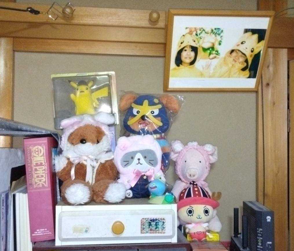 50年来のお付き合いのロビンとぶたぶたさんモデルのモンスイユのショコラMだけだと思い込んでいたけどふくふくにゃんこのハッチ、チョッパー、イヌナキンのぬいぐるみが並んでた名探偵ピカチュウのフィギュアの下にはチョッパーのフィギュアの箱が未開封、、、断腸の思いで処分したのにじわ~っと増えていくw