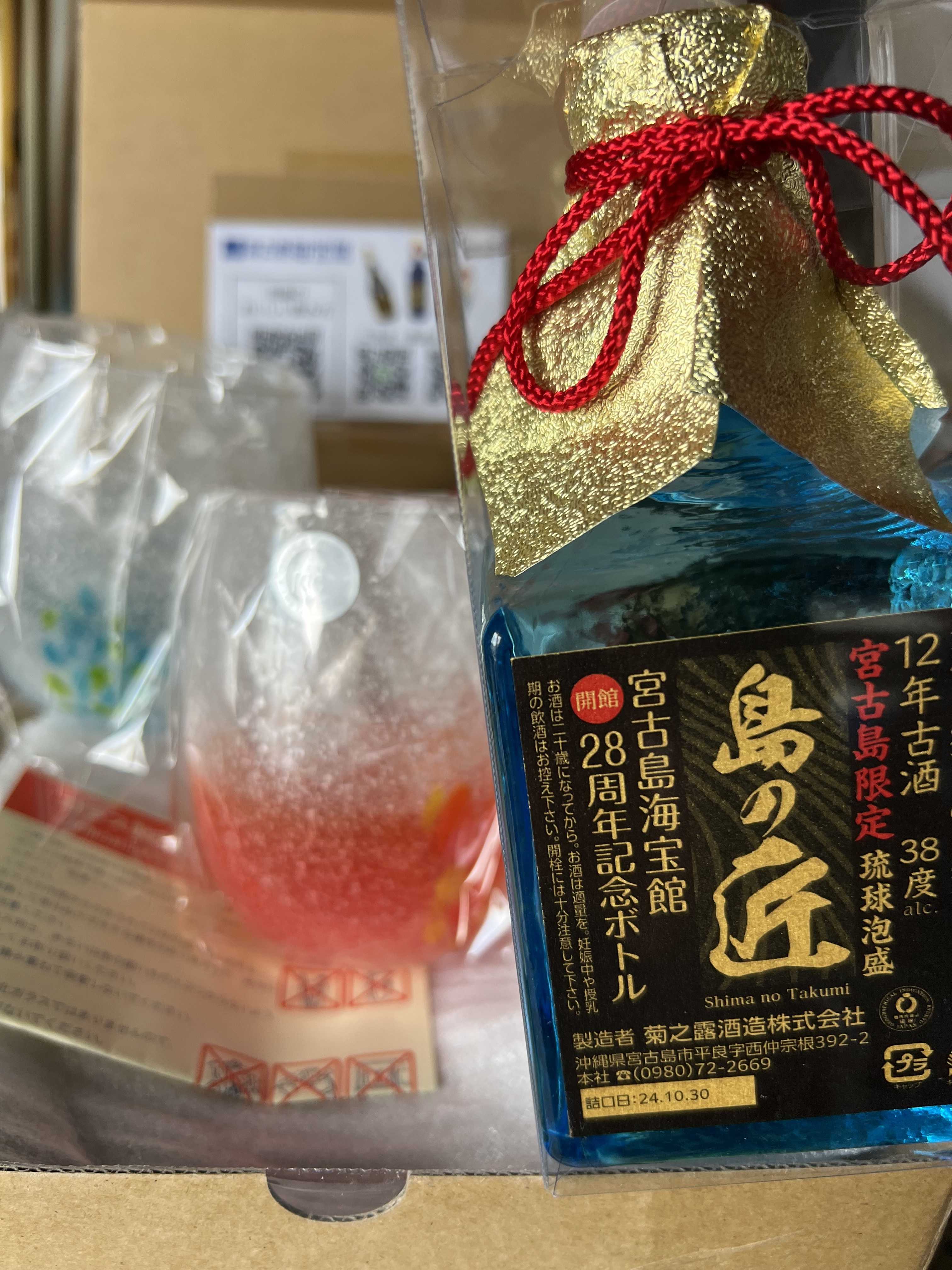 次男から届いたのがこれ。沖縄在住でたまに宮古に仕事で行くとのことで、手に入れたのだろう。酒がほとんど飲めないので送ってきたのか。琉球ガラスでボトルもグラスもできている。誕生日プレゼントということにしておこう。