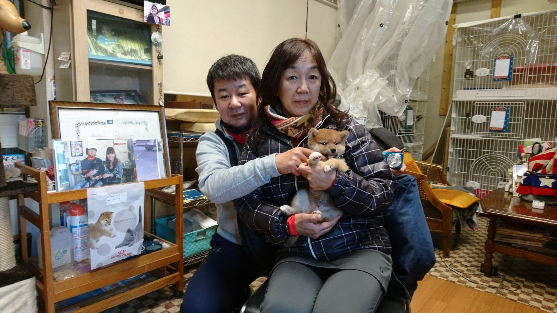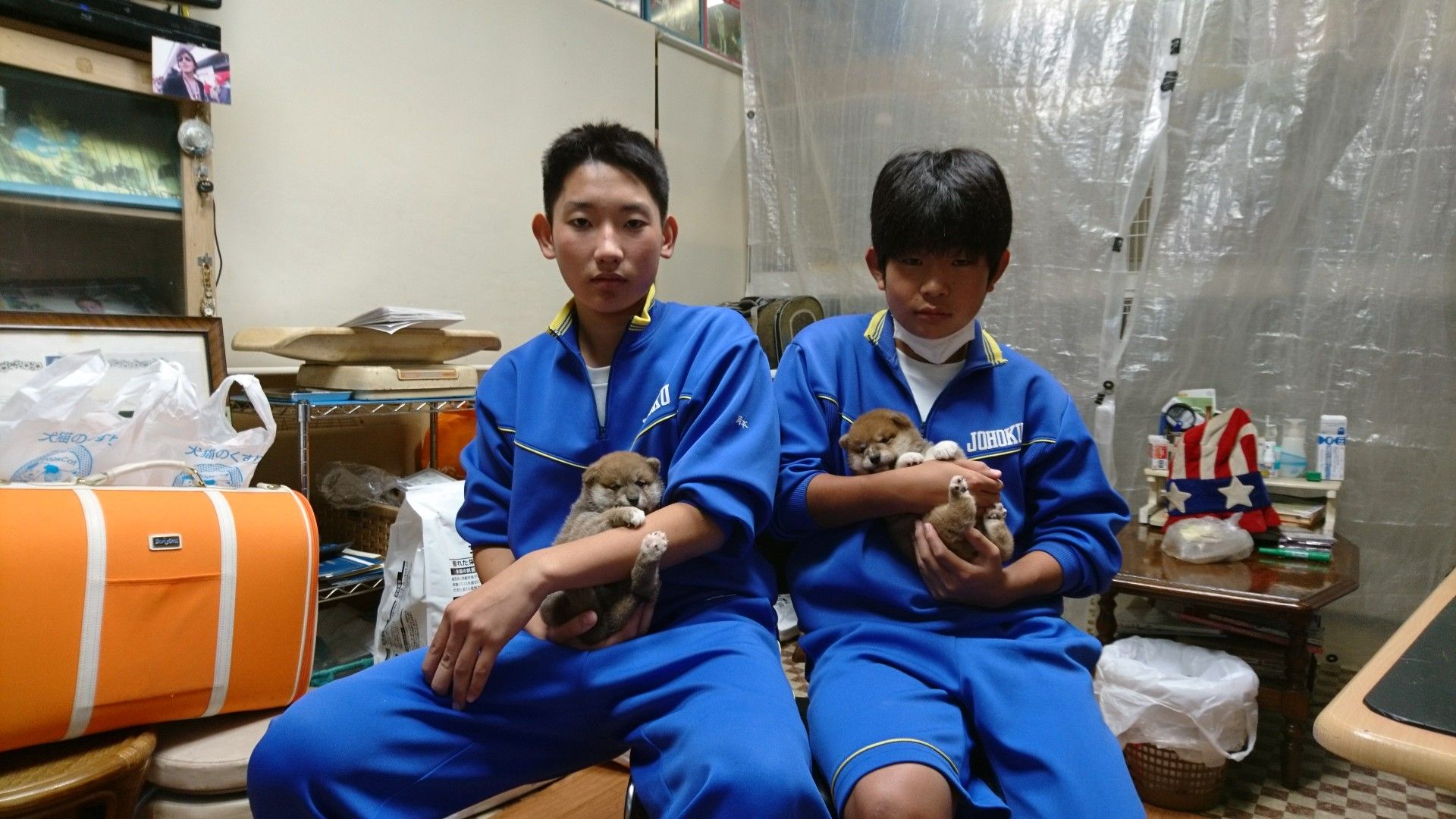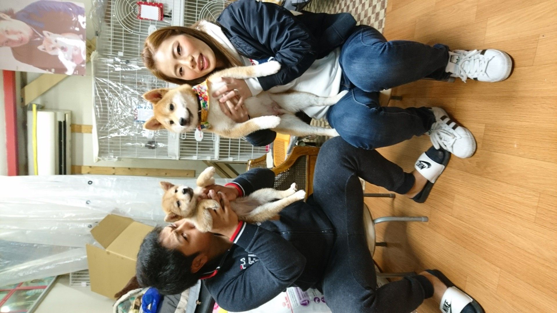 今日城北中学校の中学二年生の仲良し二人が職場体験にボストンに来てくれました、柴犬の子犬を抱いて記念撮影です。