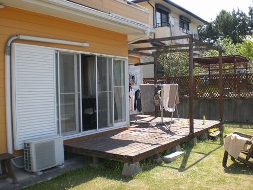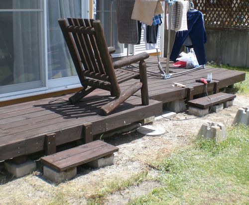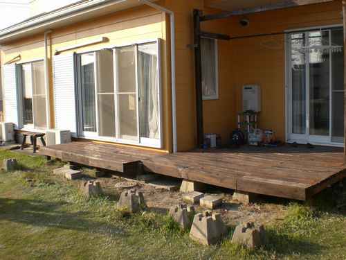 デッキ修理の2日目。朝10時の開店と共にホームセンターへ行き、防腐材入りの塗料と木ねじなどを購入。帰宅後、昨日カットした木端を塗装しつつ、腐食したデッキ材をカット、取り外しながら復帰を開始した。途中、丸鋸の空箱を持ち上げた瞬間、右腰に痛みが走った。どうも軽いぎっくり腰のような感じだ。痛みは引かないが、代わりに誰かが作業してくれるわけでもないので、ゆっくりと作業を進める。何とか午後5時にはデッキ本体の木工作業は終了した。何となく形になってきたでしょ。色を塗りなおせばそれなりになる気がしています。明日は塗装+細かい支えや階段などを製作するつもりです。腰復帰しないかな?