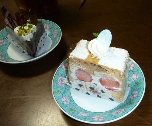 昨日、勢いで予約した中上級。天気は昨日に引き続き晴れだけど、風強しの1日でした。参加者は12名。横では貸切(OSCARのイントラ向け講習)が実施されていました。バイクは昨日と同じREVO(機体まで一緒で、昨日の走行距離が56.8kmと言う事がわかりました)赤です。イントラはN田さん。お得意のとぼけた感じで、でもガッツリ走りました。今日は、朝一からコーススラローム。N田さんから、「力はいっているね」・・・朝一にコーススラはやっぱり力入ります。でも、昨日から続けて参加で、まだ動くほうでしたが。それからベーシックにパイスラをやって、午後一またコーススラ、最後にコテコテ系(クルクルやZ字ターンも)完全に右手が腱鞘炎になりました。でもブレーキレバーがとても近いからでは?と常連の方に指摘を受けて、遠めにしましたが、痛いままで、最後は2本がけ(普段400ccは人差し指1本)にしました。でないと、バイク止まりませんでした。総走行距離は、本日は72.2kmでした。今日の練習の中、具体的なご指導は殆どなかったのですが、昨日CB1100に乗って、腰からターンをした経験と、「もっと身体を回して」と今日言われた2点を考えてみた。腰からターンを誘導すると、自分が思っている以上にコンパクトに回る。でも気になるのは、「自分がターン外側のハンドルを押し出している」感覚があること。「セルフステア」なる言葉があり、雑誌でも「バイクは勝手にハンドルが切れて、回っていく」というイメージで紹介されている。なので、出来る限りそれを妨げないようにハンドルに力を入れないように、という言葉が続く。でも、ちょっと自分は違う感じを受けている。雑誌で出ているセルフステアと、自分の走行で感じる感覚が一緒なのかわからない。自分は、腰からターンをしている(と思うとき)と、ハンドルを更に進行方向に押している。すると、更に小さく回る。本当にターンという感じ。考えてみると、腰が回る=肩が回る=ターンの外の腕は前に出て、内側の腕は後ろに下がる=ハンドルを押している、という感じだ。「押す」というと、「力ずくで」という感じに受け取られるかもしれないが、「アシストする」という方がいいかもしれない。てな感じで、渋滞を抜けて帰ると、夕食後にケーキがありました。実はすでにメールで教えてもらっていたけど、気にかけてもらえるのは、いくつになってもうれしい(今日は46歳の誕生日です)ものです。私はミルフィーユで、横は息子のチョコケーキ。さすがにまあるいケーキでもないので、各自好きなケーキを買っています。ちなみに妻はモンブラン、娘はタルトだそうです。50歳が着実に近づいています。40台の内に帰任したいですね。次は何時湖畔にいけるかな?