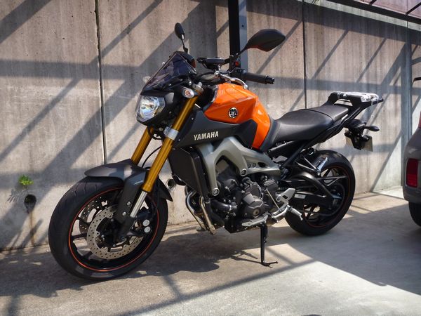仕事や雨で納車の遅れていたMT-09を今日受け取りました。帰宅するまでの10kmちょっとを走っただけですが、アップライトで幅広ハンドル、細身の車体でまるでオフ車のようです。モード切替では、STD、Bモードまでは試しましたが、Aモードはまだです。慣らし中ということもあり、6,800rpmを限度に走っている限りは、まくれることはありません。加減速では、尻グリップを意識すると走り易いです。このバイクの一番の特色は、何も積めないこと。車検証と自賠責の証書を半分に折って入れるのがやっとです。YSPでは取説などが入る立派な車検証入れをいただきましたが、宝の持ち腐れです。YSPで説明を聞いて、最初に「これ(車検証入れ)はいることろあります?」と聞いたら、あっさり「ないです」と答えられました。トップケース用のベースは付けましたが、常にトップケースを付けているわけではないのでここまで割り切っているとちょっと問題ですね。明日からまた次の金曜日まで連続で仕事です。来週末に香嵐渓まで軽く走ってみたいですね。