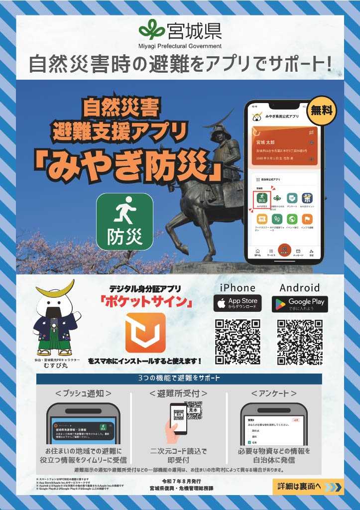 県公式アプリ「ポケットサイン」は、災害時、避難に役立つ情報をお届けしたり、避難所の受付を二次元コードでスムーズに行うことができるアプリです。 アプリ内のミニアプリ「みやぎ防災」に登録することで、次のような機能を利用することが可能(※)です。 いざという時のためにぜひご登録ください! (※)避難指示の通知や避難所受付などの一部機能の運用は、お住まいの市町村によって異なる 場合があります。 ○プッシュ通知 マイナンバーカードの基本4情報(氏名、住所、生年月日、性別)を活用し、電話番号やメールアドレスが分からなくても、自治体がアプリ利用者に必要な情報を提供できる機能です。 ○二次元コード読込による避難所受付 避難所受付の手続きがアプリで簡単に行える機能です。 ○アンケート 自治体から利用者に対し、避難生活におけるニーズ調査や安否確認を行うことができ、きめ細かな支援につなげます。 ☆☆☆みやぎポイント3,000円分ゲットのチャンス!!☆☆☆ 「みやぎ防災」を新規登録いただいた先着40万名様へ、県内2,000店舗以上で使えるみやぎポイントを3,000円分プレゼントするキャンペーンを実施中です。 お友達紹介やイベント参加でさらにポイントゲットのチャンスがありますので、この機会をお見逃しなく! ▼アプリ詳細・お問い合わせhttps://www.pref.miyagi.jp/soshiki/kikisom/application.html▼みやぎポイントキャンペーンhttps://www.pref.miyagi.jp/soshiki/fukensui/miyapor7.html