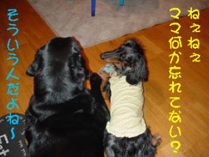 先日の外出した時 おまけはいつもよりおとなしかった親ばかな私は「もしかして少し大人になった」なんて思ったりしてでもあいかわらず普段のお散歩では動くものに手当たり次第けたたましく声をかけ無謀にも自転車を追いかけようし鳩さんに飛びつこうと悪あがきをする近所で大型犬にでくわすと必ず喧嘩を売り相手が喧嘩を買うと 短足なのをいいことに 兄貴分の体をくぐり「お兄ちゃん後はよろしく」と最後尾にまわるようするにエネルギーが余ってるんだなーとあいかわらず親ばかな私だから おまけだけお散歩にいけない雨の日はおまけを疲れさせようとおもちゃを駆使して頑張るのだおまけがおもちゃで楽しそうに遊んでいるとつられてあいつもおもちゃで遊ぶあいつがおもちゃで遊び出すと・・・必ずおまけは自分のおもちゃを放り出してやってくるあいつの邪魔になるようなところへ うま~く入り込み一瞬の早業であるおもちゃを奪われたあいつは・・・この言葉にならない「絶句」顔があんまりかわいそうで、おまけが弟になる前まであいつが独占していた私の膝を差し出すとあいつはうっとりおまけは奪ったおもちゃをその場で捨ててやきもち全開「いくらなんでもおまけが悪いよ」と私がとりあわないでいるとさすが今どきの子おまけ逆ギレ写真ではわからないけど、本当に「ハウー」だの「ウグー」だのわけのわかんない声を出しますやっぱりおまけは大人にはなってなかった・・・ただの内弁慶だーそんなおまけにめっぽう弱い私ずっと親ばかでいるから、ずっとおバカなおまけでいてね