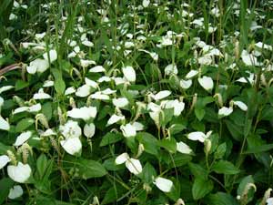 半夏生なんて読むの???答えは はんげしょう7月2日はその半夏生でした(暦の一つ)同じ名前の植物がありますモモと散歩した日曜日(7/1)に見つけましたハンゲショウの群生土手の上から何か白い花が咲いているように見えたので近寄ってみたらこのハンゲショウでした。アップで見ると一番てっぺんの葉っぱだけが白化粧しています。名の由来どおり全部白くはならず、先端は緑が残っています。にょきにょきと伸びた花よりこの白い葉っぱがとってもきれい!草丈は1メートルくらいありました。埼玉県のレッドデータブックに名前が掲載されている植物準絶滅危惧種県のみどり自然課というところへ月曜日に見つけたことをメールで送ってみました。(写真添付)今現在なしのつぶてですけど・・・