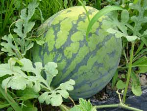 階段を踏みしめて2階へあがるとき足の裏に板の温みを感じるほど暑い雨戸を閉め、日の光が入らないようにしても室内の温度は40度!エアコンも普段よりききが悪いニュース報道を見ると40.9度!とうとう最高気温の日本記録が出た今日スイカを収穫してみました。そう!縞のない濃い緑色のすいかです。収穫したままのスイカをパチリ!全体にほんのりとブルームがかかる重さ7.4キロ先日収穫した縞のある普通のタイプよりちょうど1キロ重い洗って冷やしてみました。柔らかい布で磨けば黒々と光るはず丸のままバケツの水に氷を入れ冷やしたのですがこの暑さのため氷はすぐに解けてしまいます。切ってみるとなかなか包丁の刃が入っていかないそれは皮がとっても厚いから!まだ早かったかな?と思ったけど種はご覧のとおり黒く熟していました。あまり冷えていませんでしたが食べてみるとシャキシャキの食感と程よい甘さ。よく冷えればもっとおいしいと思います。種が小さいのは特徴的ヴォリュームのある皮、かじらないでナイフで果肉をとり皮は漬物にでも利用しようかとちょっと冬瓜のイメージ~★