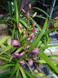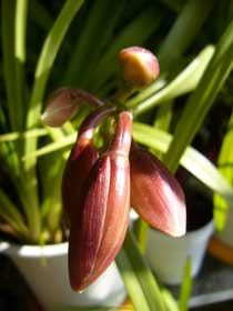 ~ほころぶ~中国製の餃子で食中毒!何でも農薬系の毒素が検出された。食べて入院された人もいるという。食の危機ますますというより不信感というより・・・・・ついに出たか!という現実。恐ろしや~農薬まみれの中国野菜でも袋から検出されたというのは???今日は気温が上がり一息ついた感じ。ふと見ると・・・コンスタントに咲いているほうのシンビジューム花丈は50センチを超えているほら!つぼみがほころびました~★そしてもうひとつ黄色の君子蘭が早くもつぼみを出し始めました。