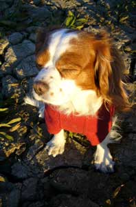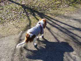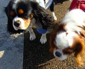 ~遭遇!ブレン&トライ~今日は朝から良い天気!でも冷たい北風が強い。昨日は来るまでお出かけするも雨のため遊べなかったモモちゃん!近くの道の駅へ出かけました。すると2頭のワンちゃんの姿が!なんとブレン&トライのキャバリアしかも以前モモをつれて訪れたとき話しかけてきたご夫婦が今回はワンちゃんを連れてきていたのでした。ブレンハイムの男の子7歳トライくんは3歳のやんちゃ盛り「モモちゃぁ~ん!!」「ぎょ!」特にトライ君は積極的にアタック!いつもながらモモちゃんたじたじ冷たい北風に吹かれてたたずむ「あたしはこうしてるのが好き」