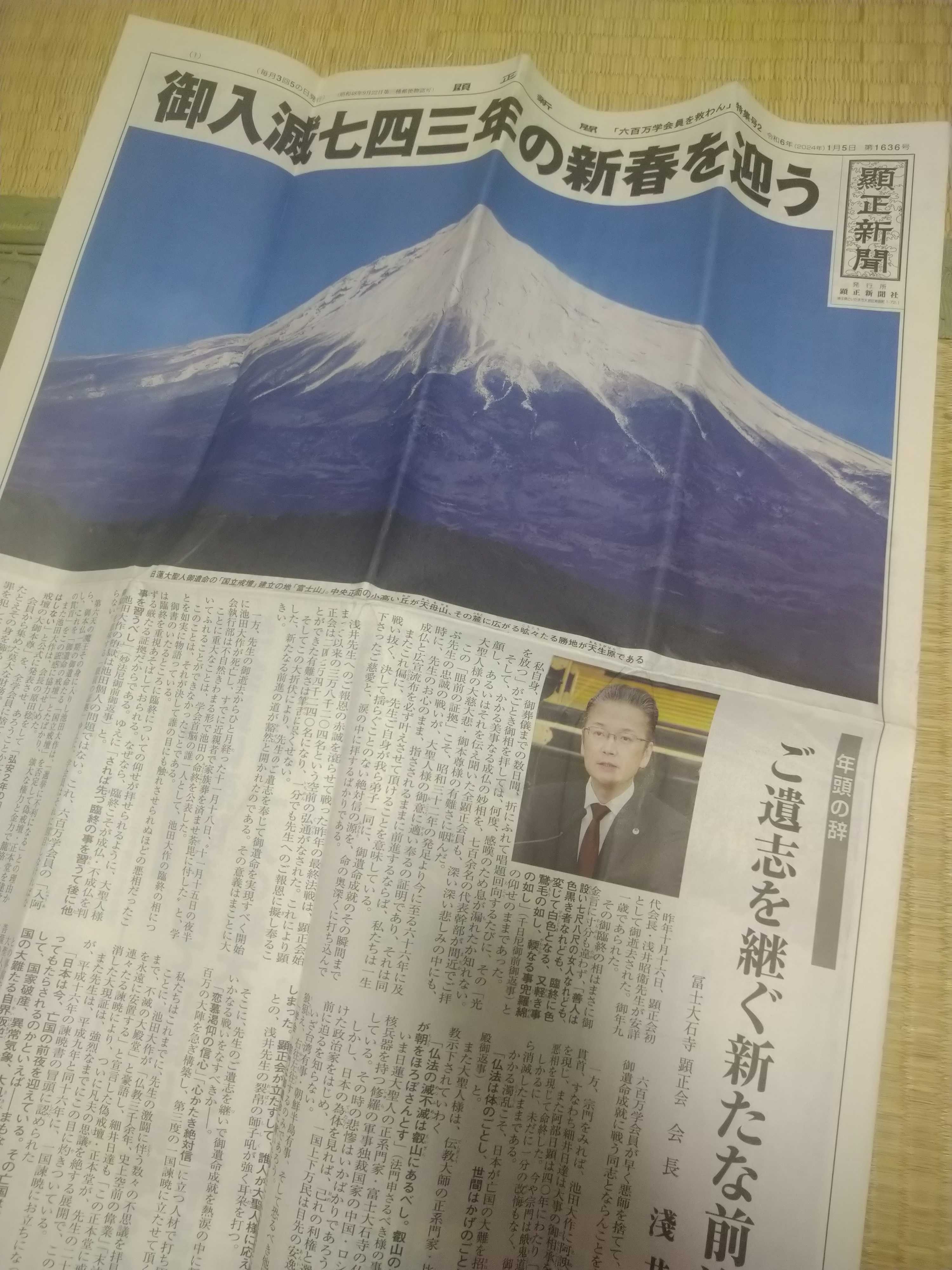 皆様、私今年は喪中の為、明けましておめでとうとは言えませんが、こんばんは無所属原人です。今年は暖冬で雪かきに体力を奪われることが無く、その分、週末には息子と公園へ遊びに行ったりと大変有意義に過ごしております。一方、昨年末は母親の死去で、自分自身グタグタになっていたので、今年こそは明るい1年になってくれたら良いなと思う今日この頃です。直属の班長はと言うと相変らず、私が実家に居る時を狙って、新聞をストーキング投函しております。全く懲りずにご苦労なことですね。御託はここまで………。本日は、毎年恒例の顕正新聞元旦号についてお話していこうと思います。先ず、初っ端から感想を申しますと「会長が代替わりしても、結局昭衛氏の時代と何ら変わりありません」ってのが私個人の感想です。強いて変わったと言えば、例年と違い、今年のお題が【元旦特集号】から【600万学会員を救わん特集号】に変わったのと、表紙写真が昭衛氏から城衛氏に変わった事位です。その城衛氏ですが、今回の新年挨拶を読んで私が感じたのが、「総男子部長時代から何ら変わらないな。」ってのが第一印象でした。まぁ、お決まりの浅井センセー(先代会長)讃嘆に始まり、総男子部長時代から変わらない棒読みスタイル、先代会長の教えを焼き写しただけのスッカラカンな指導内容、先代会長死去で宗門と和合を期待していた私を含め皆の思惑に肩透かしをカマす先代会長の思想踏襲。と、視点を替えれば結構刺激的ですが、その他体験発表なんかを見ても、先代会長時代からなんら変わらない、幹部連中の空元気な活動報告、真偽不明な体験発表など、読んでる途中で我ながら呆れかえりました。現役顕正会の皆さん、もういい加減、顕正会の異常さに気付きましょう。辞めた後は私の様に無宗教になっても良し、元の寺檀家に戻っても良し、日蓮正宗に行って武闘派になるも良し、今からでも遅くはありません。自分としての人生は一度きりなんですから、井の中の蛙になり、顕正会活動にのめり込んで自身の有限な時間を無駄にせず、もっと自由に生きましょう。人様に言える身分では無いのはわかってますが、今を大切に生きる。亡くなった母親から教えられた気がします。乱文失礼、ではまた………。